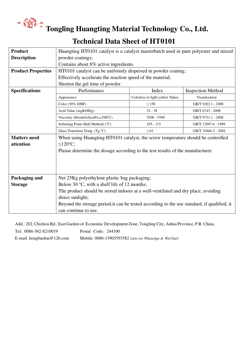 HT0101 —— 32-38 2500-5500 61 —— Catalyst masterbatch for TGIC, PT910 or hybrid powder coating systems,enhance the reactivity.
