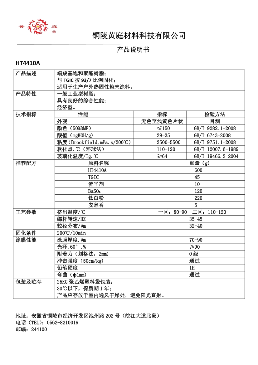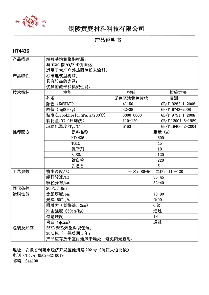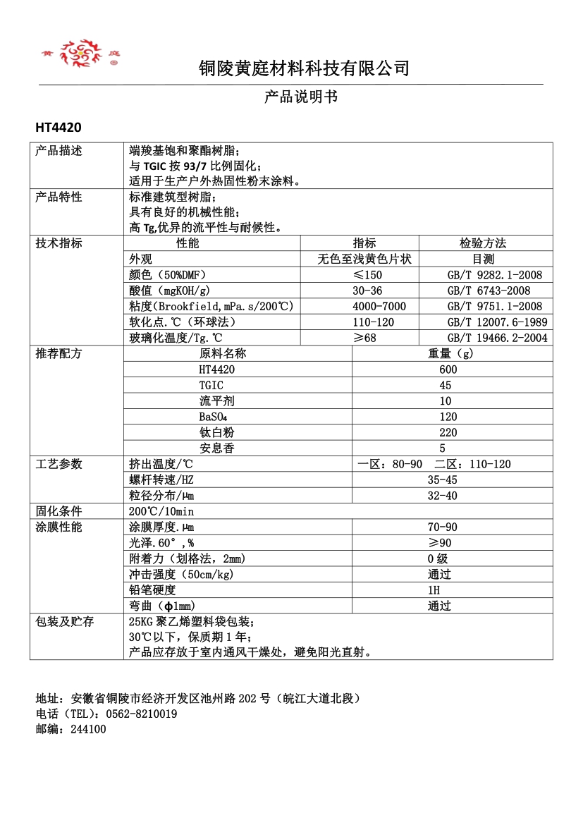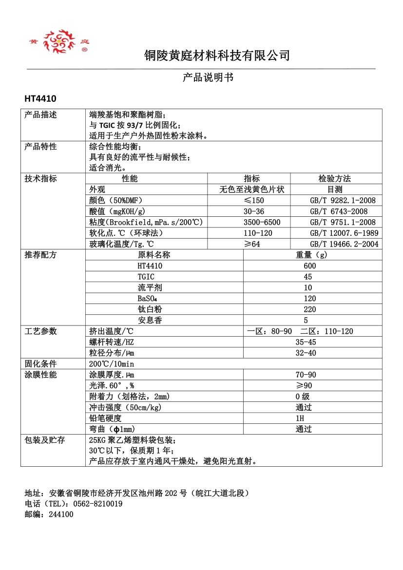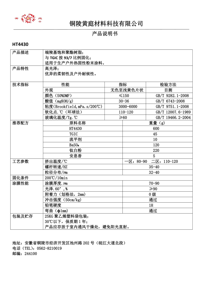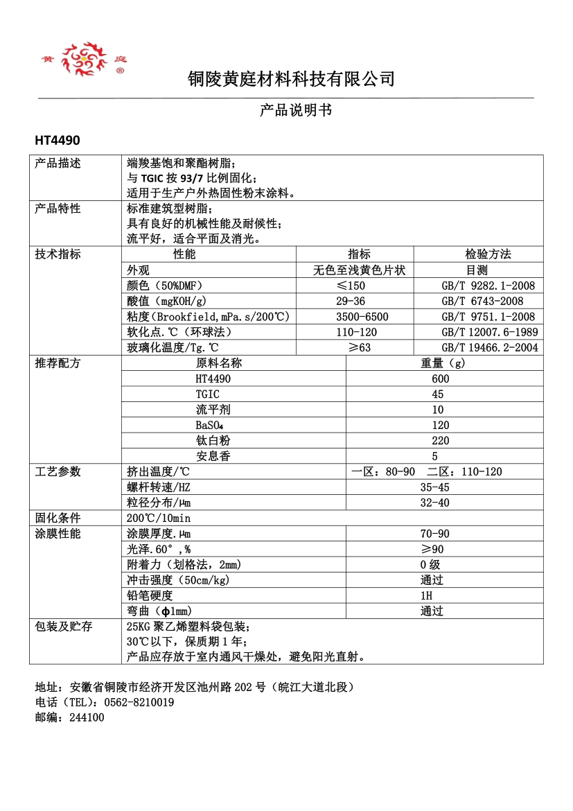 HT4490 93/7 29-36 3500-6500 63 200/10 流平好, 耐候性优,适合哑光粉末涂料。