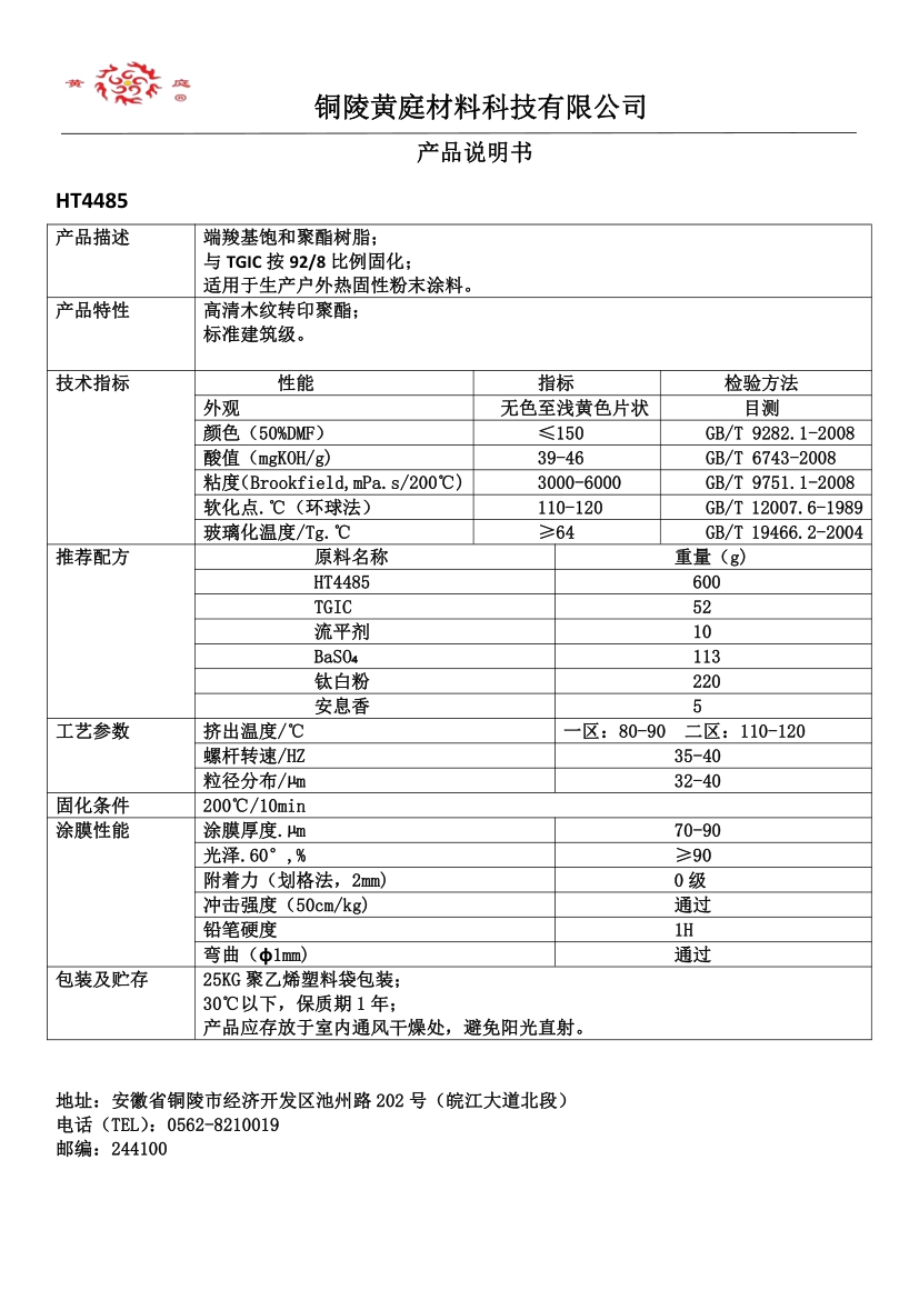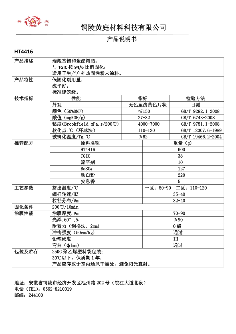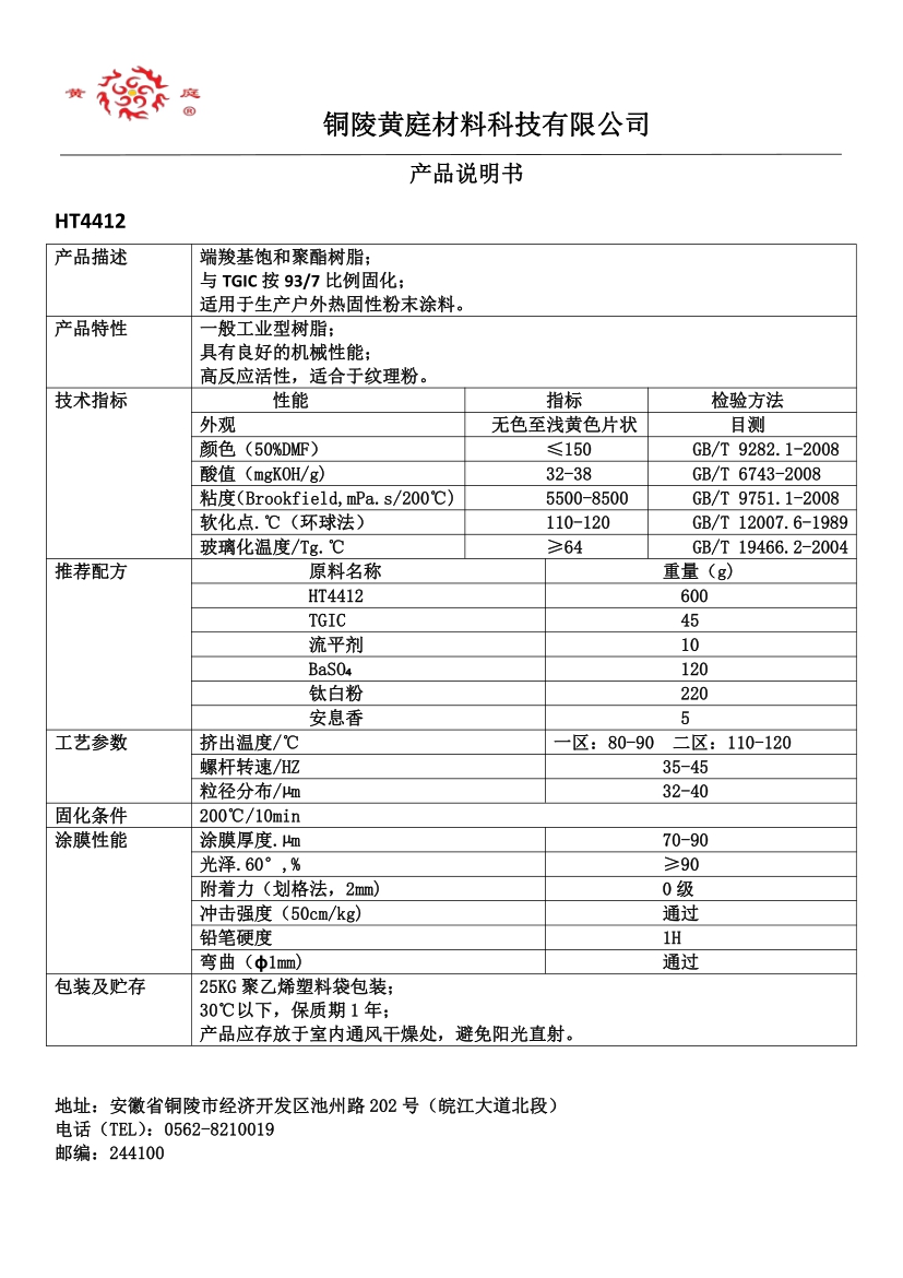 HT4490 93/7 29-36 3500-6500 63 200/10 流平好, 耐候性优,适合哑光粉末涂料。