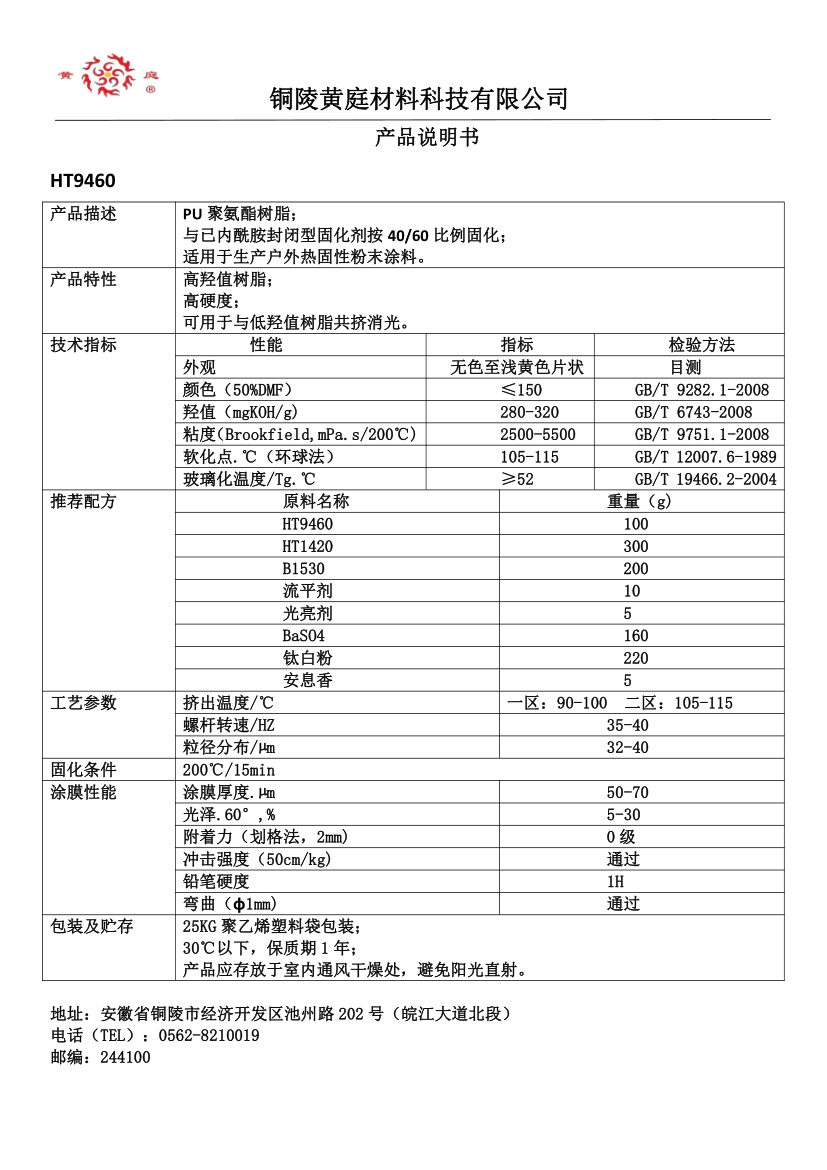 HT9408 93/7 27-35 1500-4500 63 200/10 双固化树脂,可同时与TGIC 和异氰酸酯反应, 高硬度,耐化学药品性优,可用于转印粉。