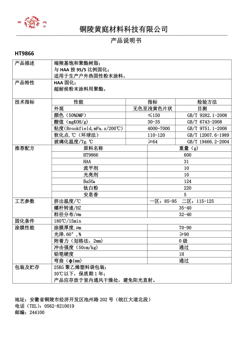 HT9866 95/5 30-35 4000-7000 64 180/15 HAA 固化超耐候粉末涂料用聚酯。